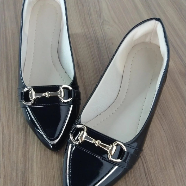 Sapatilha Bico Fino Preto Verniz com detalhe Dourado
